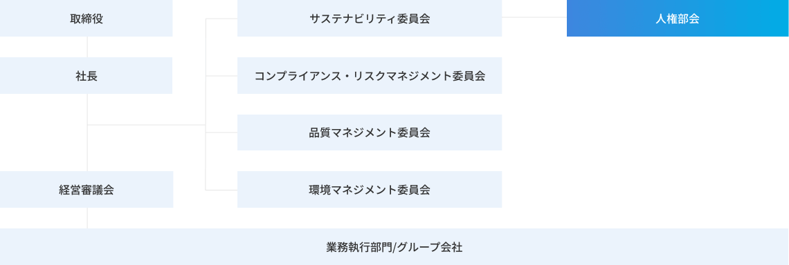 堺化学グループは、人権課題への取り組みに関する活動を実行する機関として、人権部会を設置いたしました。 人権部会は、ESG経営を実践する組織であるサステナビリティ委員会の下に位置しており、当社のサステナビリティ推進体制とも連携しております。